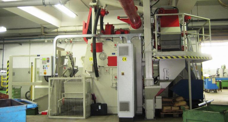 Das System für den kontinuierlichen Rückfluss und die Reinigung vom Scheuermaterial ermöglichen gemeinsam mit den wirkungsvollen Turbinen aus verschleißfesten Materialen eine Hochleistung der Maschine.Die Standartausstattung bei den größeren Maschinen umfasst: PLC, Display, Timer, automatische oder manuelle Arbeitsweise, automatische Einschaltung der Turbinen, Arbeitsstundenzähler usw. Die Maschine kann mit einem Magnetseparator, einem Vibrationstransporter und einem Turbinenumrichter ausgestattet werden.